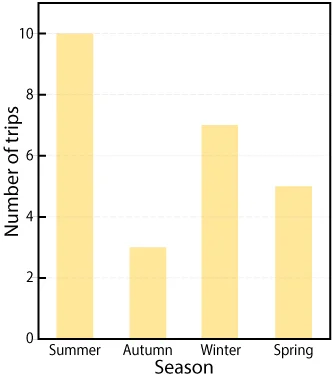 The first plot I made was purely for interest and to show the sort of travellers we were. I am not sure what I expected, but it was something probably more uniform that what was observed. I don't think that it can be discounted that I arrived in autumn and did not travel much as I lost my camera. Similarly, the end of my time in Europe was summer and we travelled pretty heavily in the last few months.