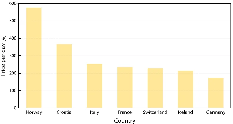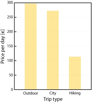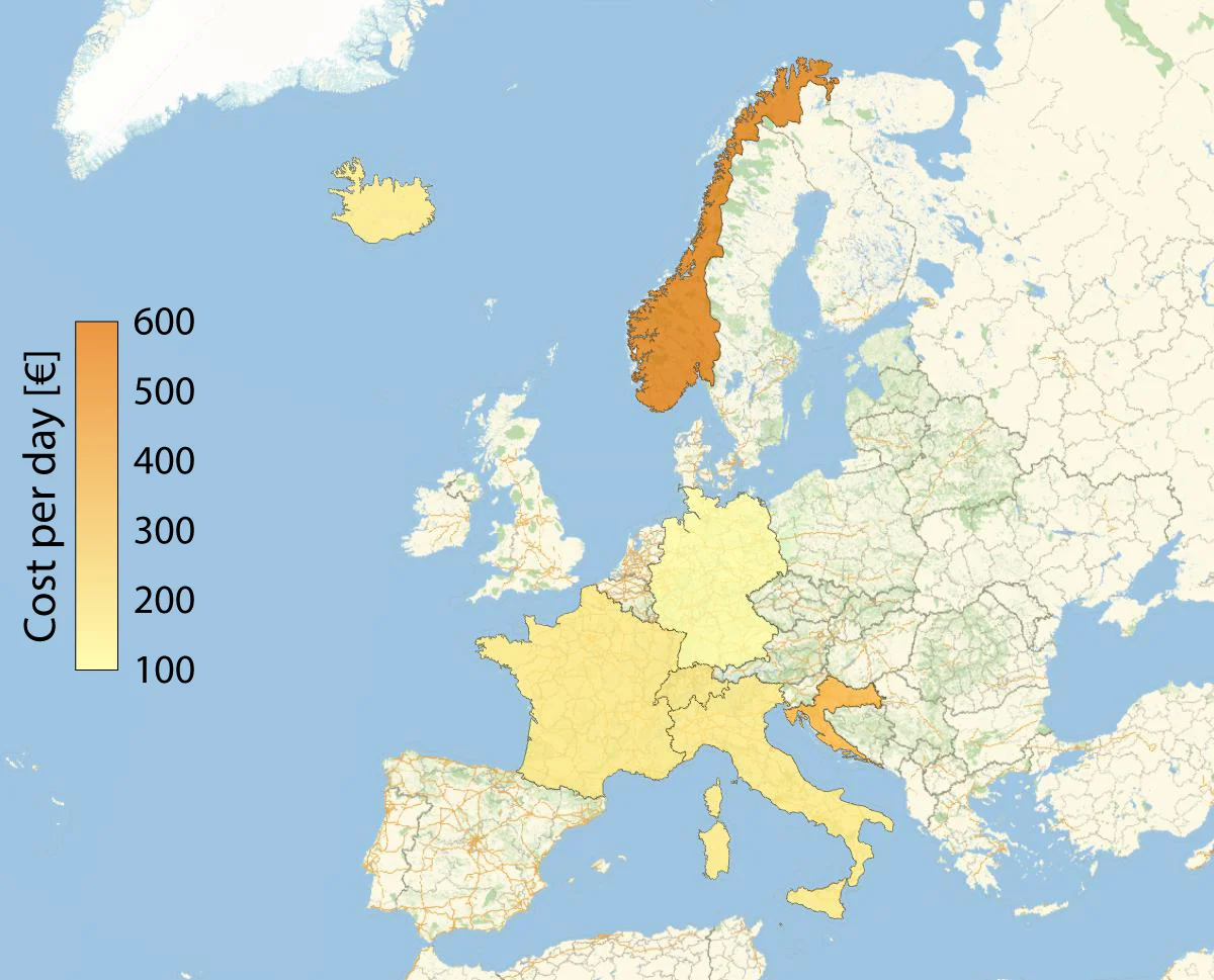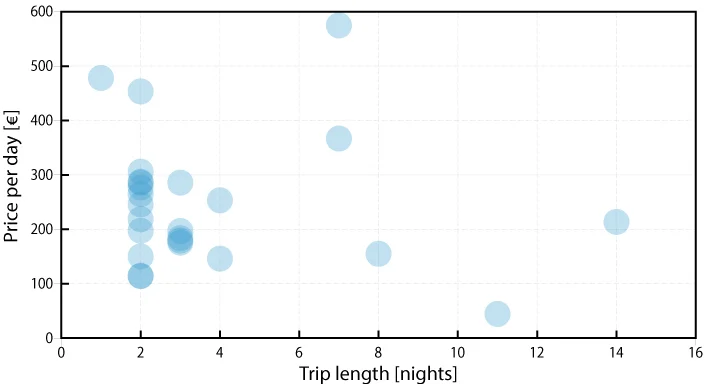 This is a plot of the trip length versus the price per day of the trip. You can see that most trips were two nights long and spread over one to three hundred euros a night. There were a few outliers in terms of special events, for example a birthday weekend in Switzerland is never going to be cheap! The most expensive was our trip to Lyon for la fête des lumières as we could not find any reasonable accommodation and ended up in an upmarket hotel. I think the really interesting points are the longer trips. The cheapest long trip was some time we spent in and around Paris, meaning we did not have to pay for accommodation, which clearly is a major contributor. On the other end of the spectrum is a one-week trip we took to Norway in mid-winter where we paid to do a lot of activities. Our week-long trip to Croatia was also quite expensive, mostly due to car hire and lots of ferries - but these are things that almost any tourist would do, so perhaps it is not quite the cheap destination that people may expect. An eight day trip to the ski slopes in France was quite reasonable at about 150 €/day, and likewise, our two week trip to Iceland cost only 200 €/day including car hire.