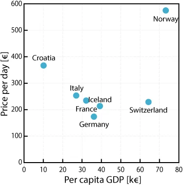 Just for a point of comparison, I looked at the price per day versus the 2014 GDP per capita values for each country and unsurprisingly there is little correlation with our data. Most noticeable are Croatia, for which I have little explanation, and Switzerland, which can be attributed to the low cost of hiking.